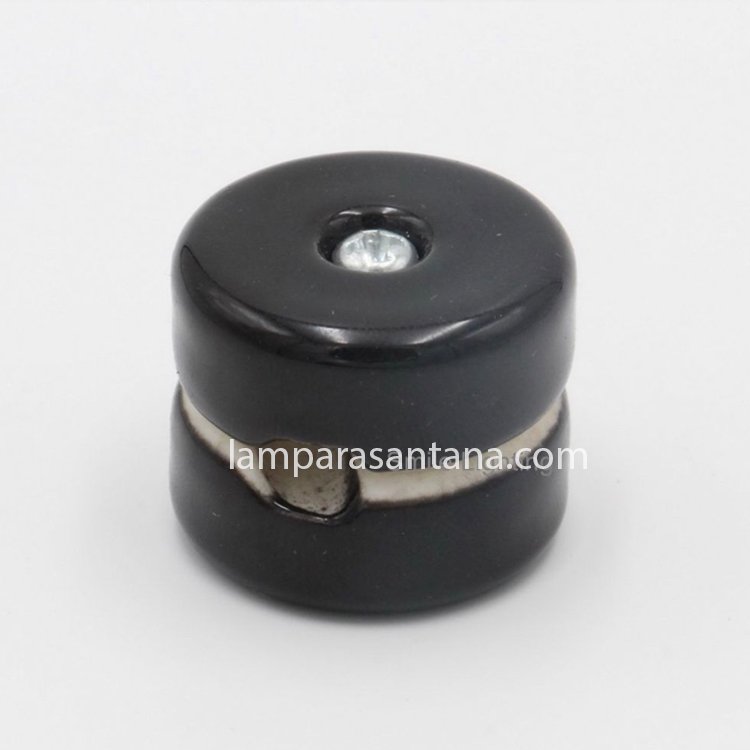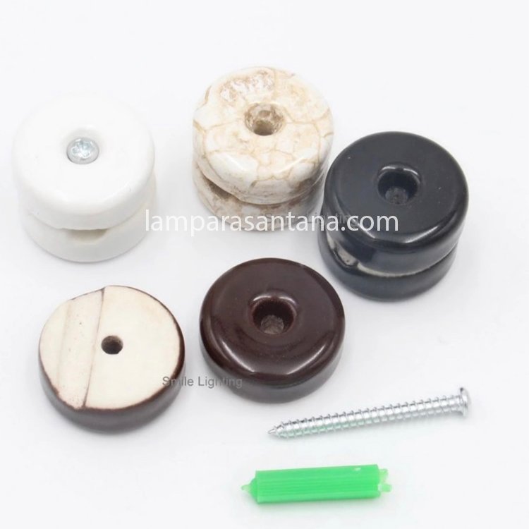 Aisladores de porcelana de varios colores para cables textiles o de silicona redondos. CaracterÃsticas: Fabricación en porcelana vidriada Tamaño 30mm x 24mm Adecuado para cables 2×0,75 y 3×0,75 Cada unidad dispone de tornillo y taco. Ideal para lámparas araña tanto de techo como de pared y cualquier tipo de montaje sobre pared. Los únicos en el mercado para cables redondos textiles o de silicona. Para otros colores consultar. Disfruta de la variedad de accesorios y recambios para lámparas de Lámparas Santana.