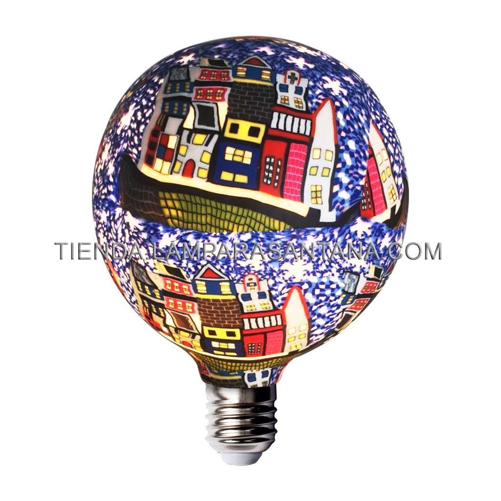 Bombillas decorativas led silicona decoradas con casas. CaracterÃsticas:  4W E27 360 grados 230V 20000 horas Medidas: 125mm x 165mm Los nuevos modelos de bombillas de silicona crean un efecto divertido para salas de estar dormitorio restaurantes etc. No necesitarás ninguna lámpara especial la propia bombilla realza la decoración provocando un efecto luminoso y decorativo. Disfruta de los accesorios y recambios para lámparas de la tienda Lámpras Santana.