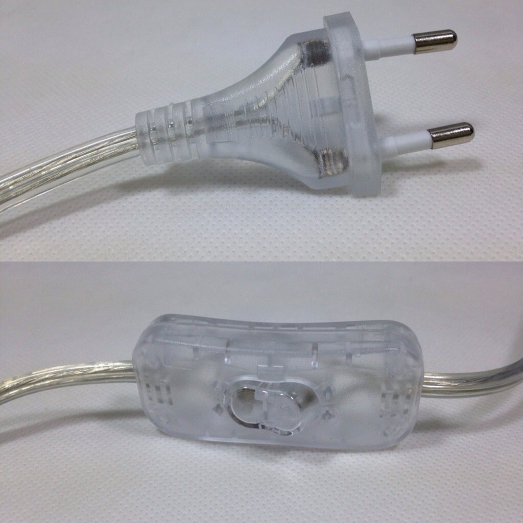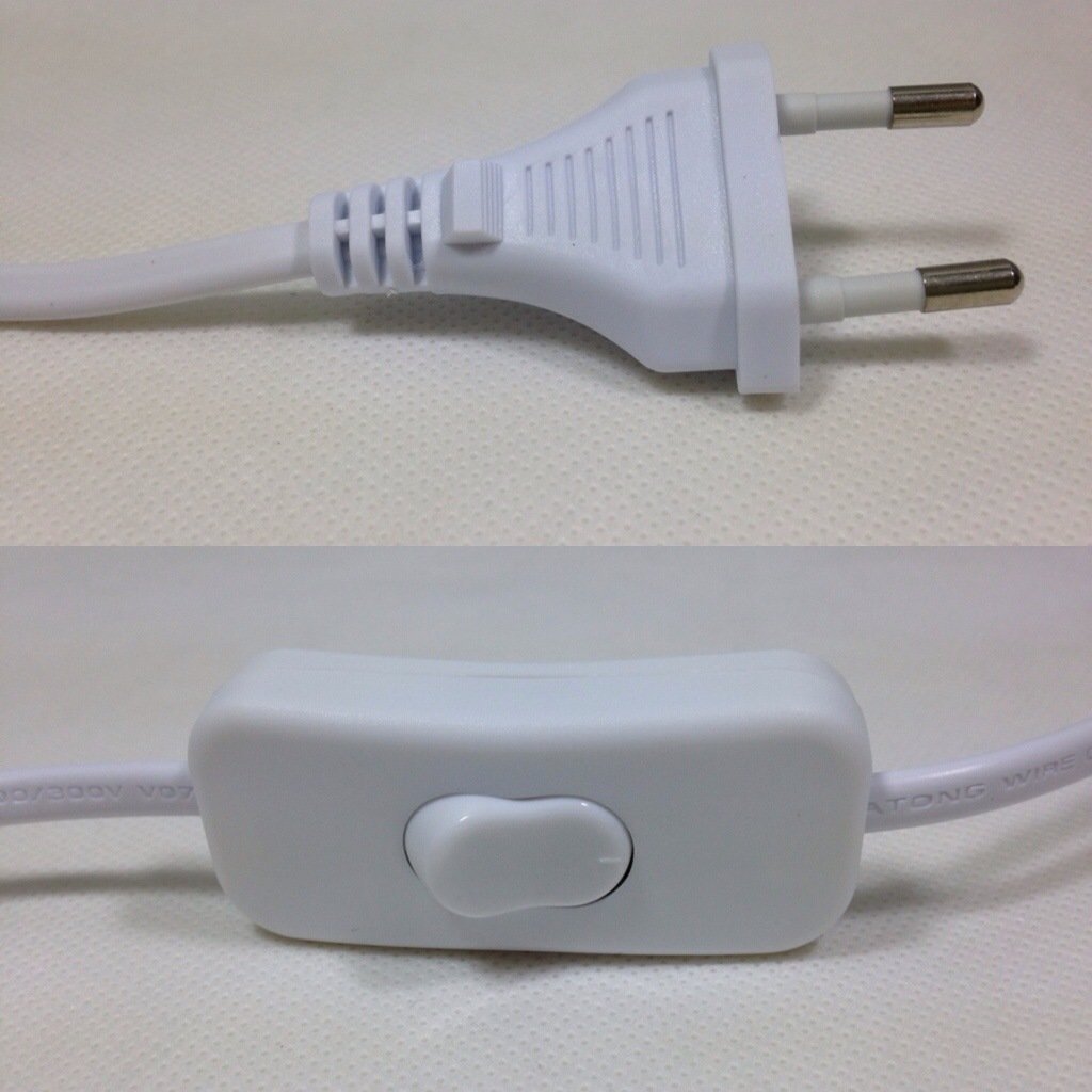 Conexión de cable para lámpara compuesto por clavija, interruptor y cable. Manguera plana 2×0.75 con interruptor de paso y clavija termosoldada en un extremo. Longitud: 2 metros aprox.