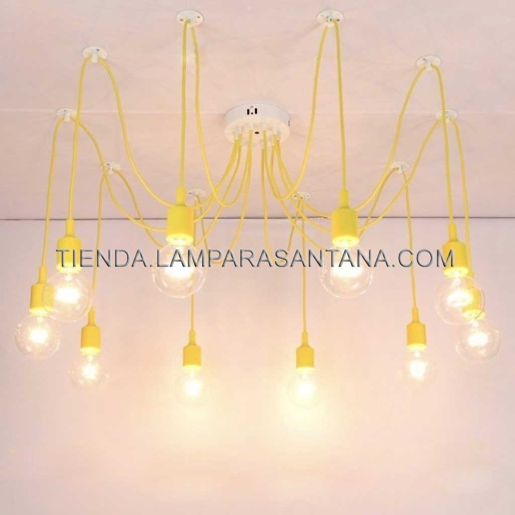 Lámpara Araña Vintage Amarilla. Soportemetálicoen blanco y portalámparas de silicona azul. Para combinar con bombillas Edison, incandescentes o LED.