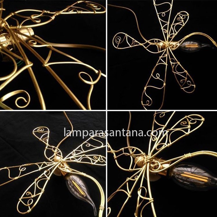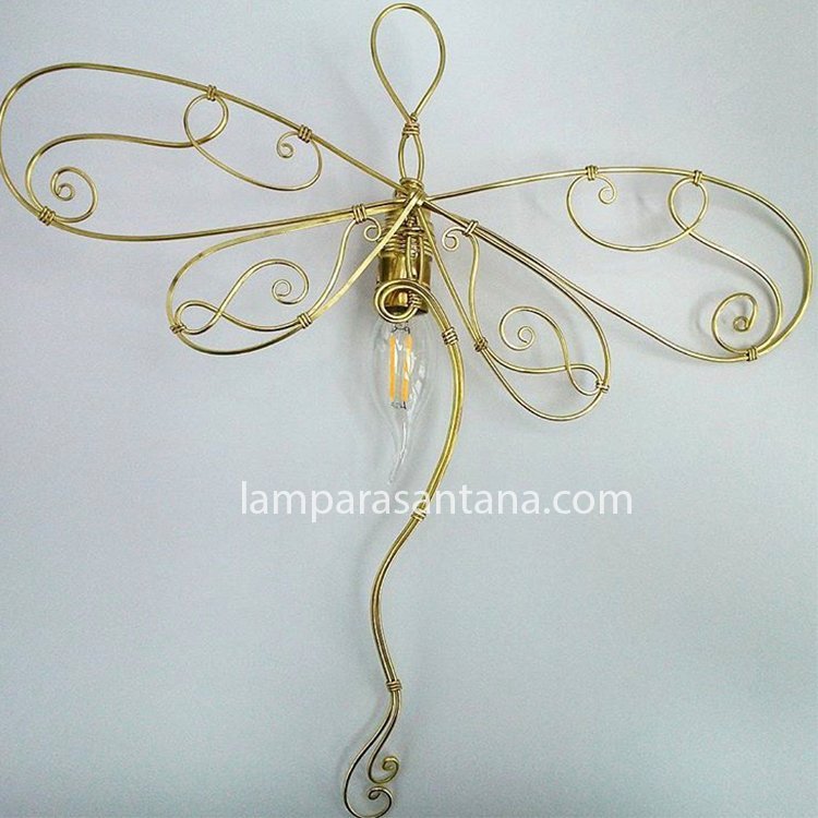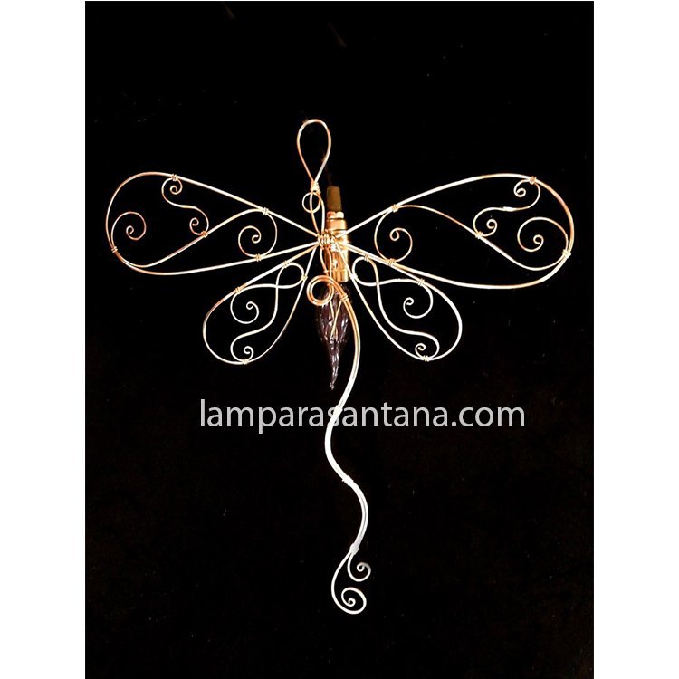 Lampara libélula de la colección insectos fabricada de forma artesanal en cobre o en latón. Características: Fabricada en alambre de cobre o latón portalámpara a juego con el alambre e14 metálico interior de porcelana 4A 230V Cable textil 1,5 mt 2×0,75 a con interruptor intermedio y clavija a juego Medidas aproximada 40×40 Boombilla no incluida Esta colección se fabrica de forma 100% artesanal sin soldaduras como única herramienta se utiliza alicates al ser un producto artesanal las medidas pueden variar ya que no hay dos insectos exactamente iguales. Son ideales para cualquier tipo de decoración tanto de mesa como de…