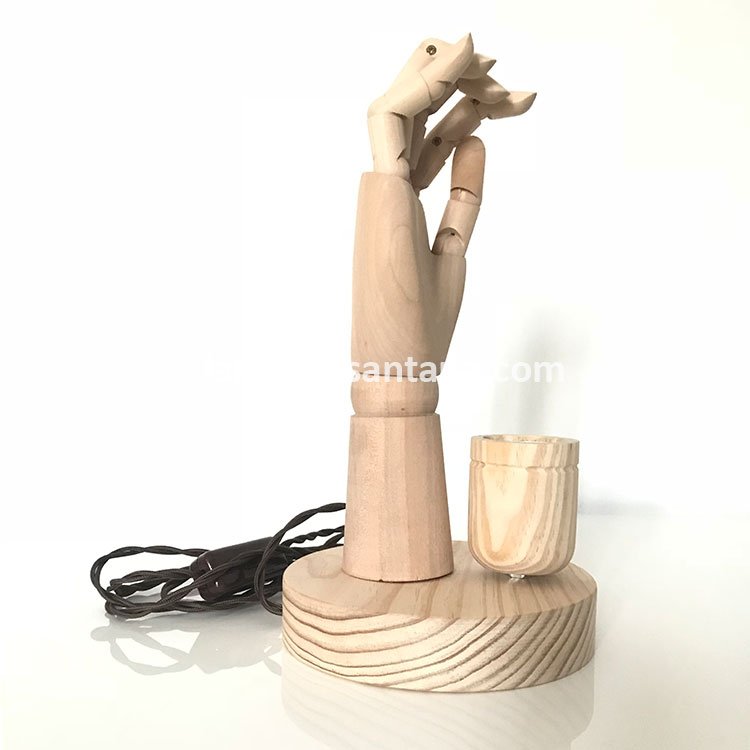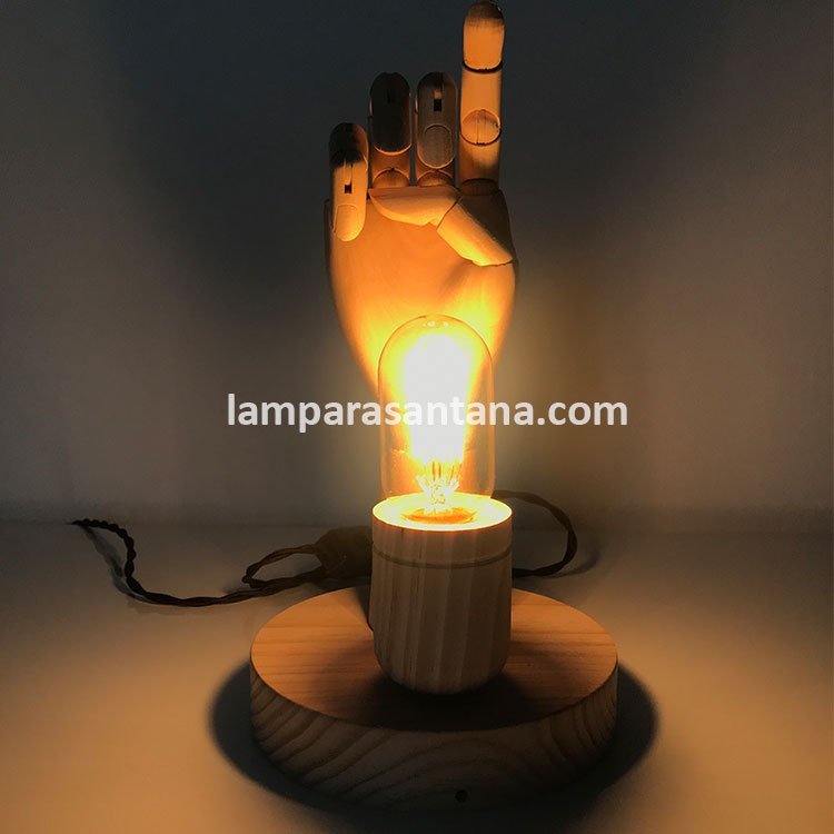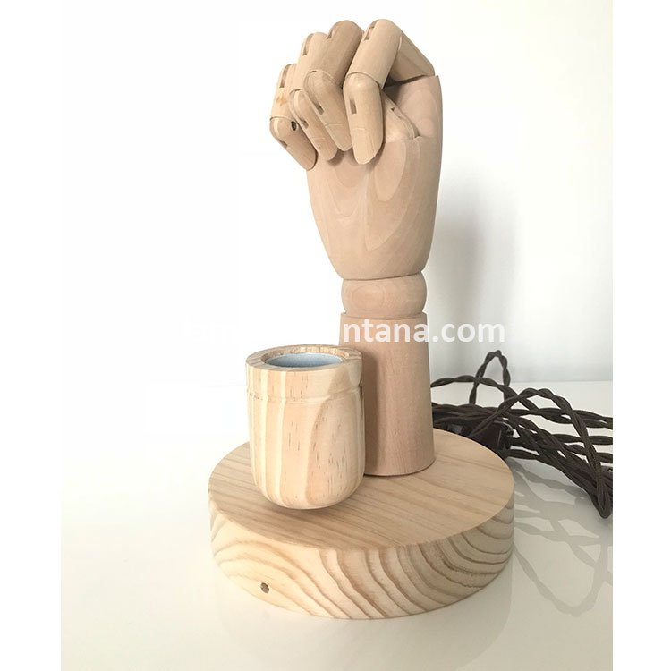 Lampara fabricada en madera de pino español macizo con portalámparas y mano articulada de madera. Medida: 12 de diámetro. Peana mano articulada extendida: 25cm Características: cable textil negro trenzado 1,5 metros 2×0,75 mm con clavija y interruptor a juego 10A portalámpara E-27 Máximo 40W Bombilla no incluida. A esta lámpara articulada puedes ir cambiándole los dedos dependiendo del espíritu con el que te levantes cada día. Queda perfecta para mesas auxiliares o para hacer algún regalo. Un modelo exclusivo creado para un regalo de cumpleaños con tanto éxito que se empezó a fabricar para disfrute de todo el público