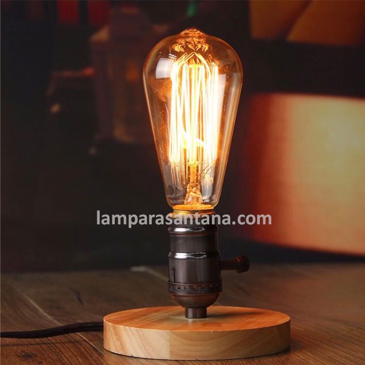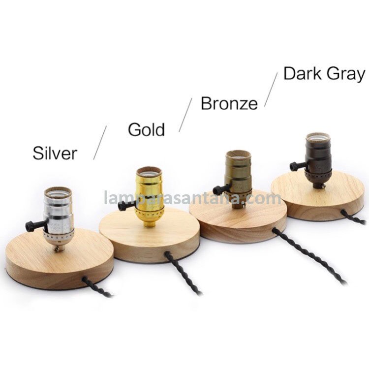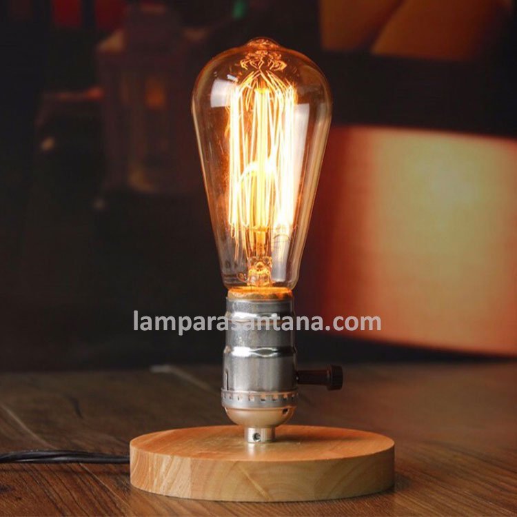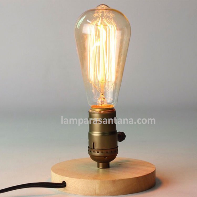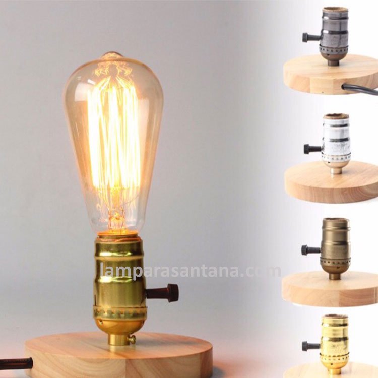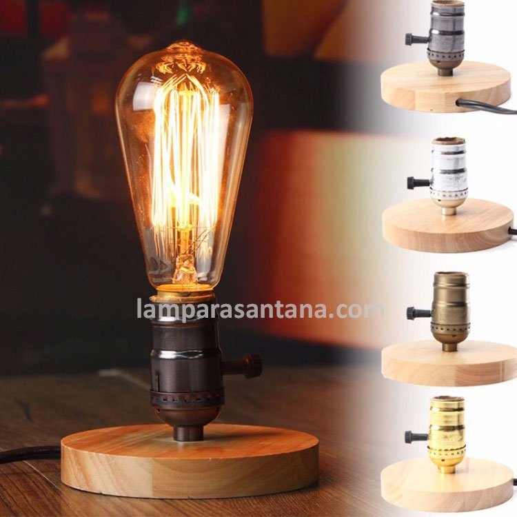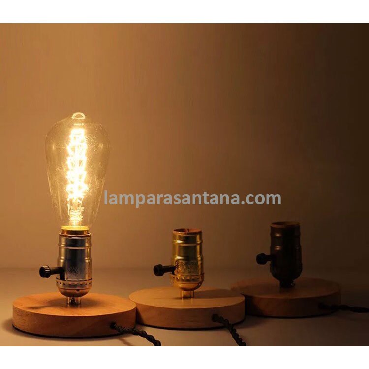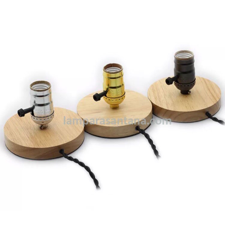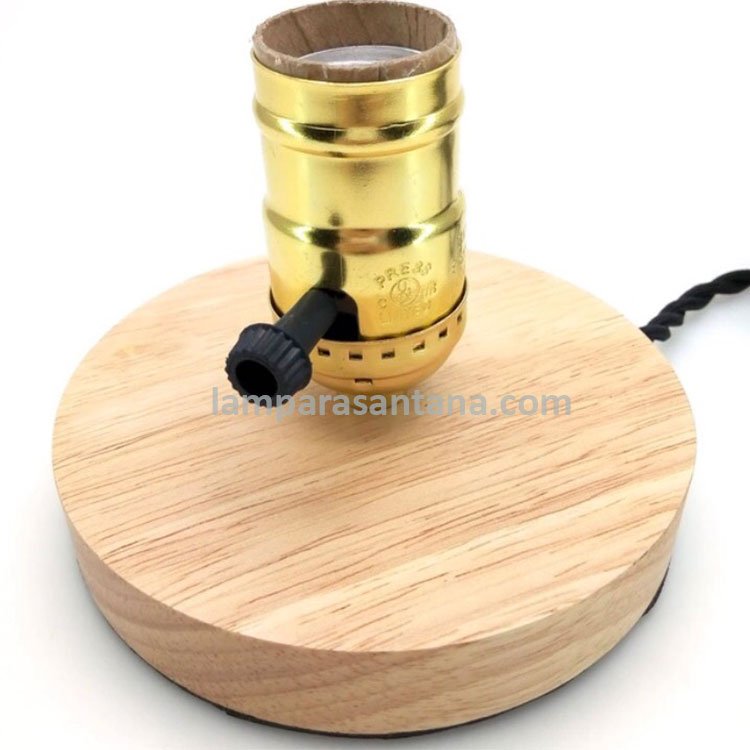 Lámpara de mesa con peana de madera recreando las antiguas palmatoria de madera ahora actualizadas con portalámparas con interruptor incorporado. Cable textil negro trenzado con portalámparas cromo negro dorado y anticuario Medida peana pino 14 cm Altura aproximada 12cm Características portalámparas E-27 con interruptor on-off de perilla plástica 4A 230V máximo 40W. Cable textil negro 1,5 mt 2×0,75 con clavija negra 10A Bombillas no incluidas Esta lámpara de mesa artesanal rustica queda perfecta para iluminar cualquier tipo de mesa supletoria aportando calidez elegancia y nunca pasa de moda. Combínalas con cualquiera de nuestras bombilla vintage. Para otros colores de cables…