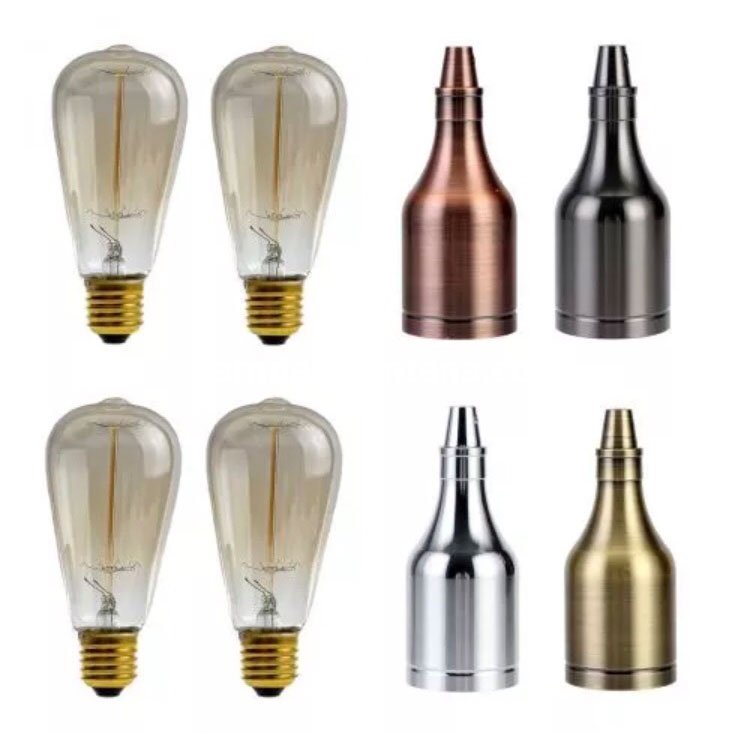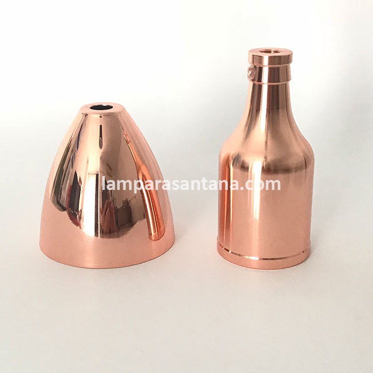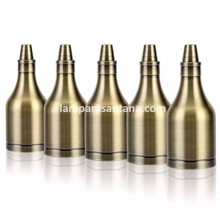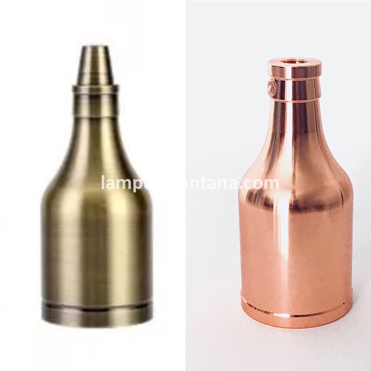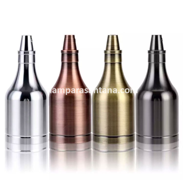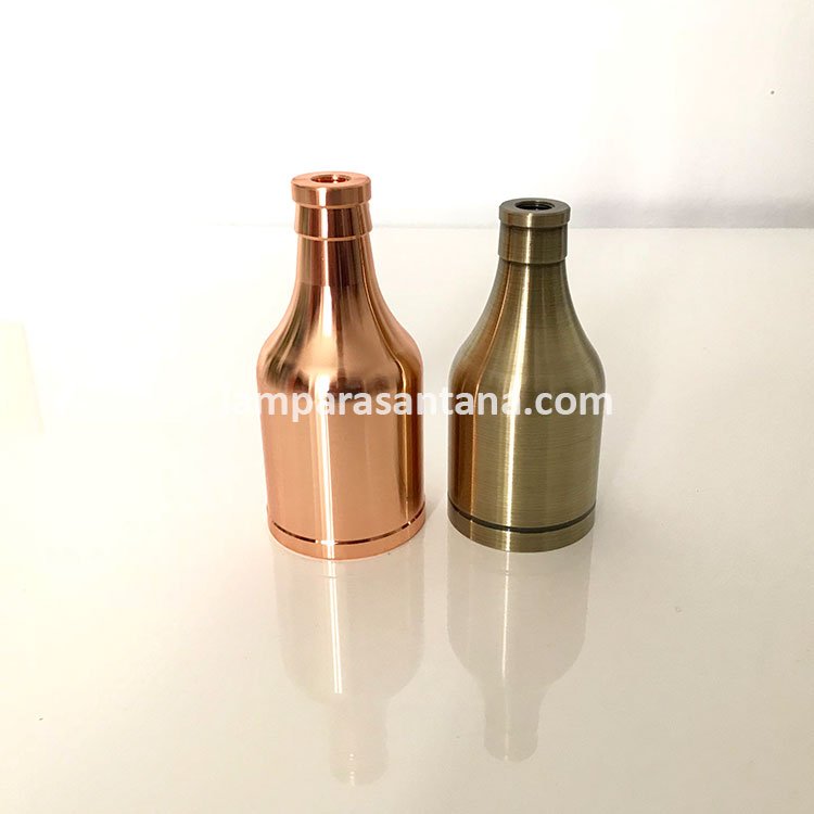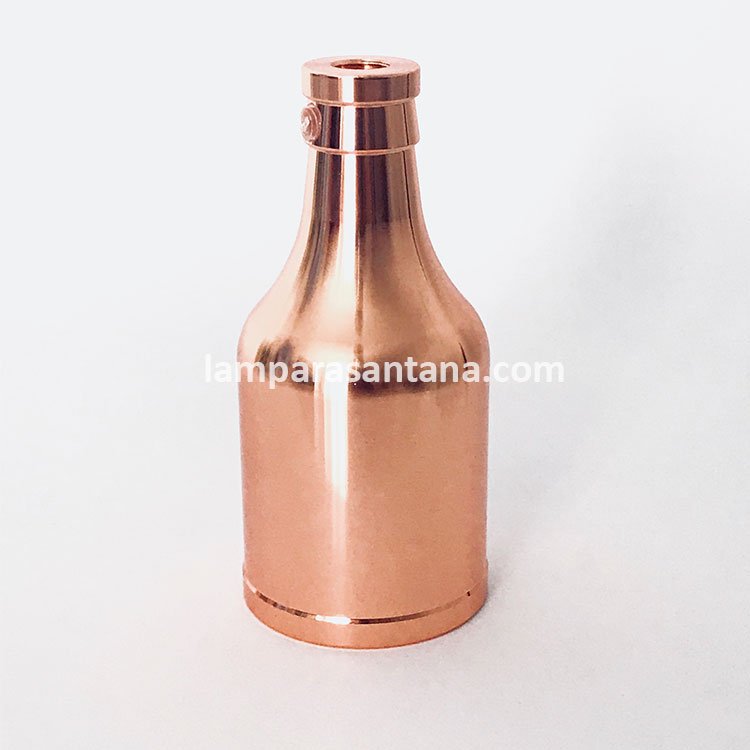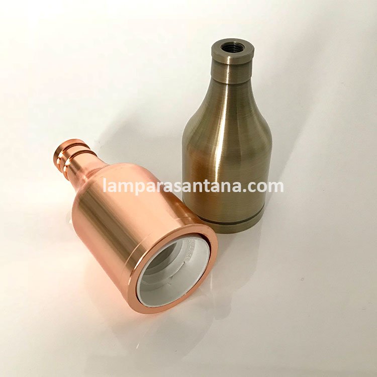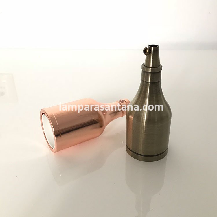 Portalámparas metálico con forma de botella. Disponible en cobre y bronce . El portalámparas más exclusivo y elegante para que luzcan tus bombillas. Especial para lámparas colgantes. Medidas 110mm altura 45mm ancho Características: exterior hierro esmaltado, interior cobre, baquelita interior bronce, porcelana 4 A 230V Máximo 40W Presacables metálico incluido Bombilla no incluida Para otros colores de portalámparas consultar. Este nuevo diseño de portalámparas estiliza más aún las lámparas colgantes de forma individual en araña o racimo. Combínalo con nuestras bombillas decorativas cables textiles y florones a juego.